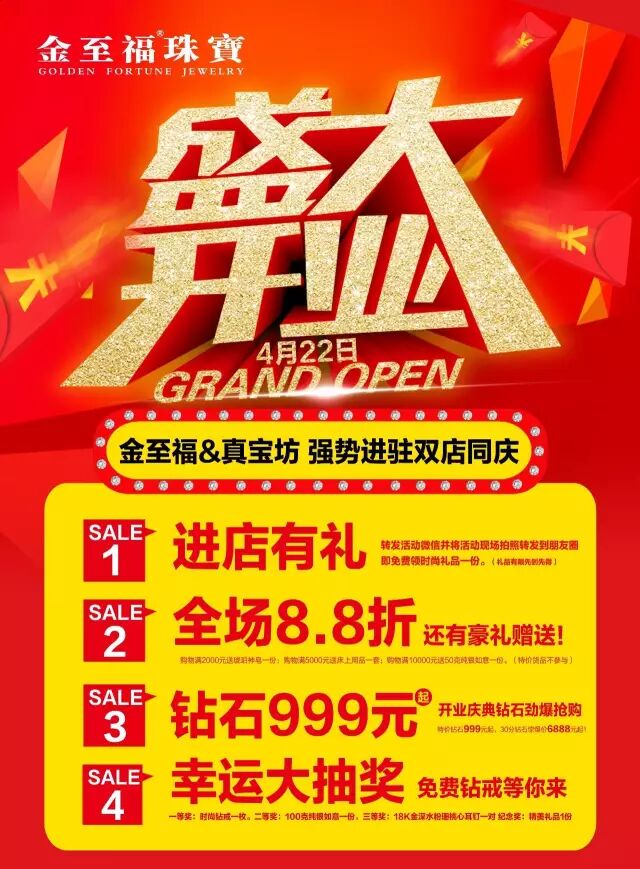 左旗开元购物中心,地处左旗最繁华、最成熟的商业街,金至福珠宝的强势入驻,将为左旗喜爱珠宝的朋友们带来精致珠宝的饕餮盛宴及时尚潮流的愉悦享受!此次左旗开元华美绽放,金至福珠宝为消费者引爆首饰热潮,展现金至福珠宝品牌的影响力与爆发力!热情、朝气的金至福珠宝将在这个暖阳四月为内蒙消费者隆重献上的盛宴。