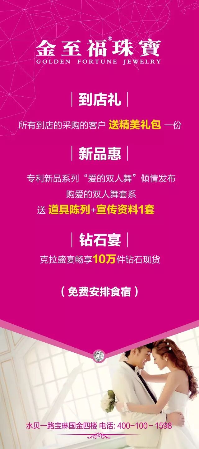 一重礼:到店礼 到店送精美礼品 所有到店的采购商送礼包一份 二重礼:新品惠 专利新品系列“爱的双人舞”倾情发布 购爱的双人舞套系送道具陈列+宣传海报1套 三重礼:钻石宴 克拉盛宴 畅享10万件钻石现货