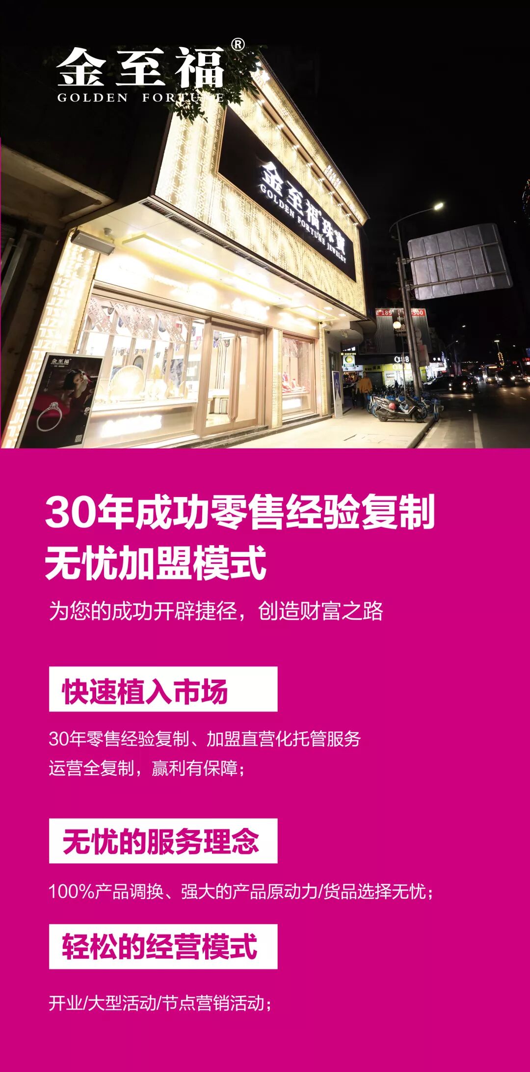 金至福品牌创立于1988年,源自香港,是专注于情感文化传承的珠宝品牌。金至福运营总部位于深圳,拥有4000㎡、10万件现货的品牌展厅,加盟、联营专卖店近300家,足迹遍布全国26个省、市,先后为3亿多消费者提供了优质的服务。所到之处均受到消费者的认可和深深喜爱。金至福以“传承文化,传递幸福”为使命,将中华文化之美融入珠宝,结合独特的情感文化设计理念,为每一件珠宝注入情感、赋予灵魂,打造出有幸福温度的珠宝,让永恒传承的珠宝承载人的爱情、亲情、友情,见证一段时光,诠释一场永恒,闪耀人生的每个幸福时刻。